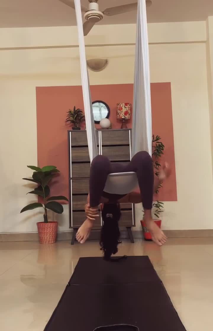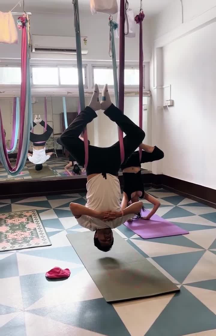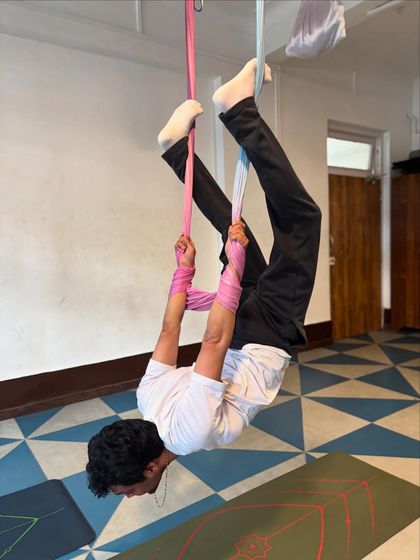 The hammock provides safe support to hang upside down, helping to decompress the spine and improve circulation without any pressure on your neck. We guide you through various inversions, from simple hangs to more advanced poses, at a pace that feels right for you.