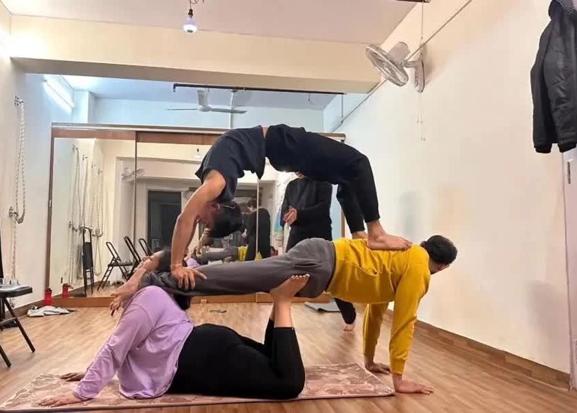 This is the core of acroyoga, where one person acts as the 'base' on the ground and the other is the 'flyer' in the air. My classes break down these roles step by step, focusing on techniques to build the core strength, stability, and trust needed to perform these poses safely.