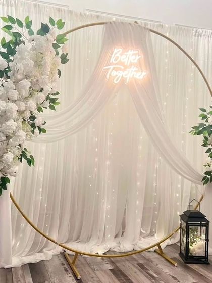 Modern engagement backdrop designs are my thing. I set up circular frames, arched panels, and neon signs like 'Better Together'. Flowers and balloons (white, gold, red), special seating for the couple, and surprise proposal setups with rose petal pathways and candles.