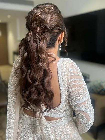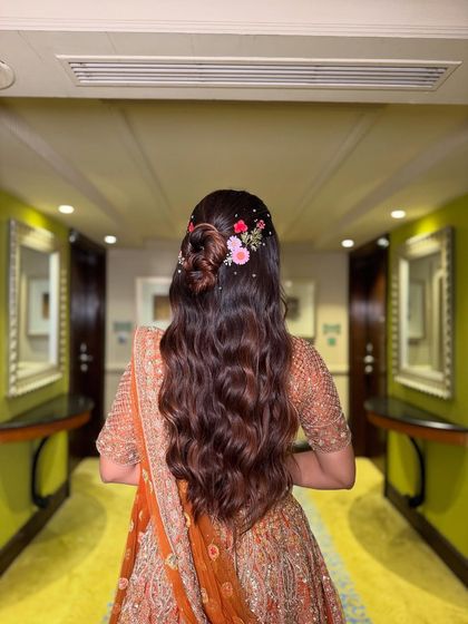 Bridal Hairstyling for All Events - I do buns (sleek, messy), braids (fishtail, balloon), open curls, and half-up styles for mehandi, sangeet, wedding, reception.