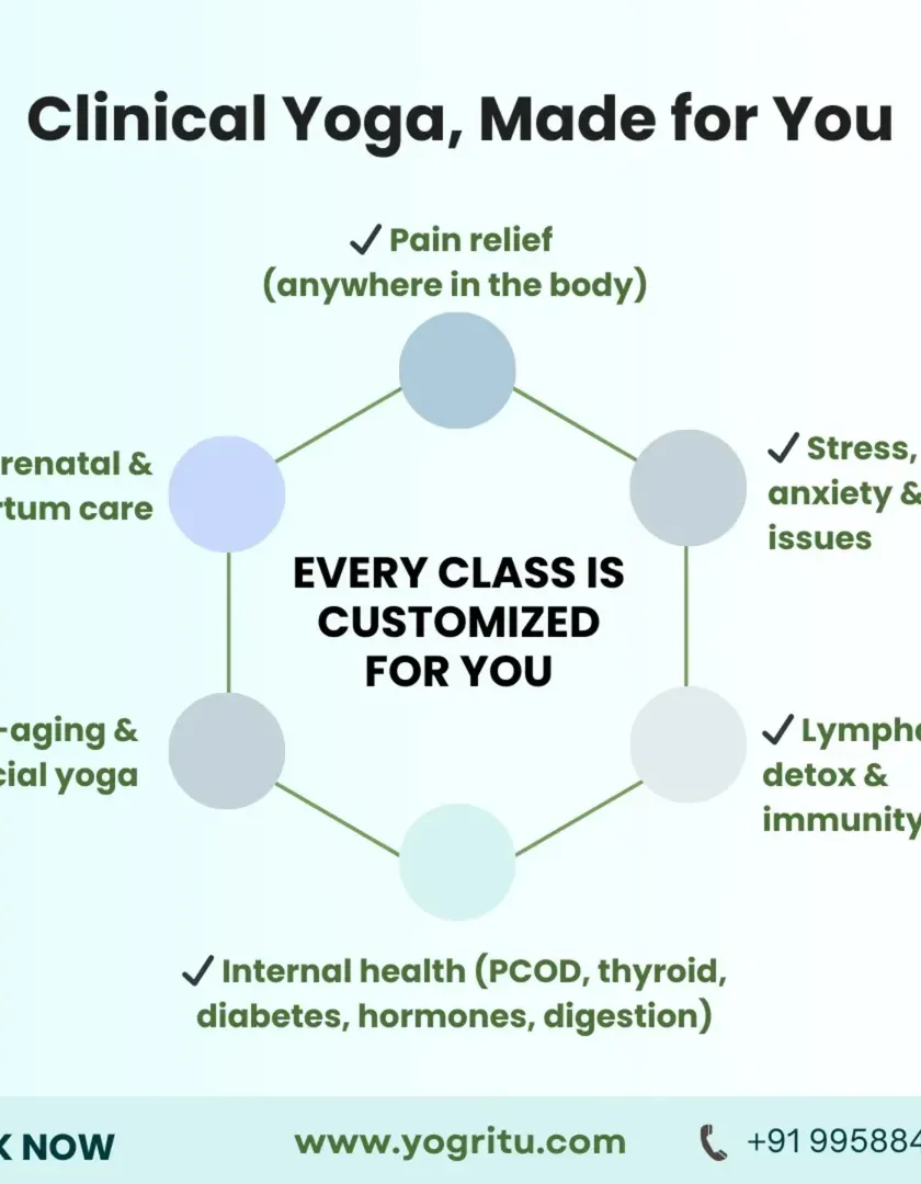 I use clinical yoga to address the root cause of health issues, not just the symptoms. My customized plans target specific conditions, from hormonal imbalances like PCOD and thyroid to chronic pain, digestive issues, and pregnancy support.