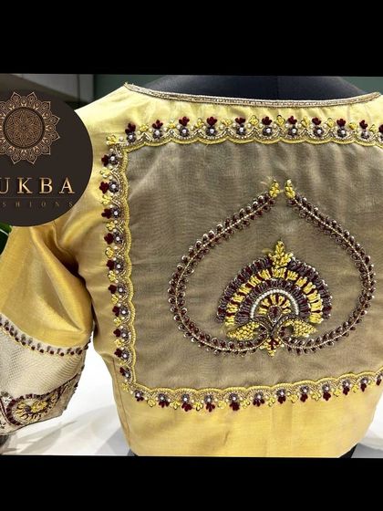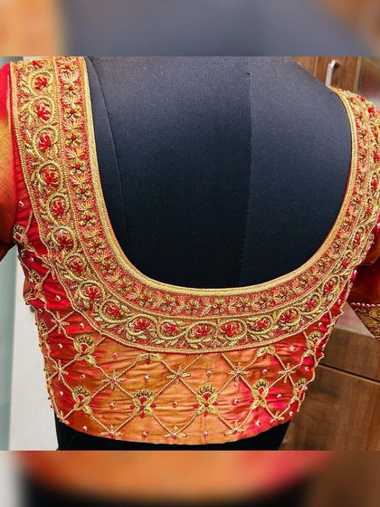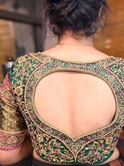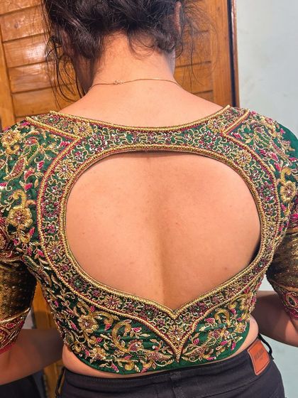 I make hand-embroidered blouses using aari, zardosi, and resham work, custom-designed for your saree after a detailed consultation.