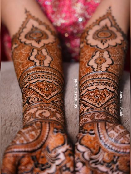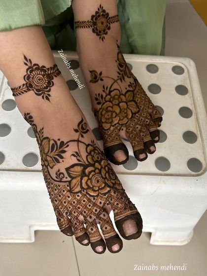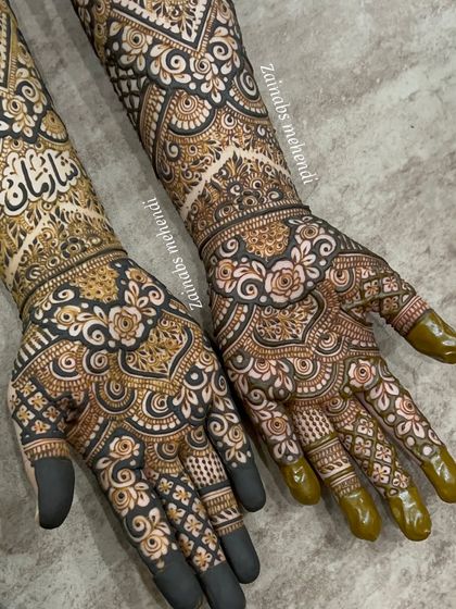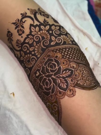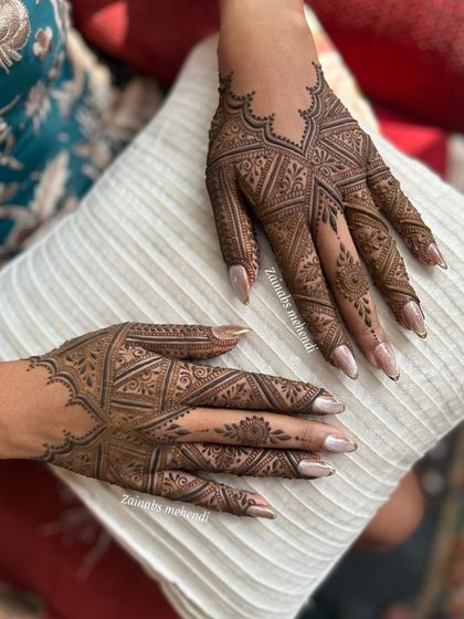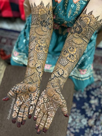 I create bridal mehendi with detailed Pakistani and bold Arabic designs, add custom names or motifs, use only natural henna for dark stains, and can travel to your location.