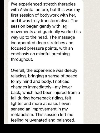 This is a form of therapeutic, assisted stretching and massage inspired by Thai massage techniques. In these sessions, I use my hands, feet, and body weight to guide you through a series of yoga-like postures, helping to release deep-seated tension, improve flexibility, and restore your body's natural alignment.