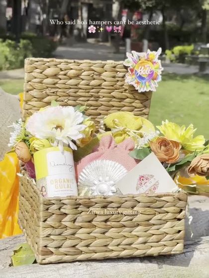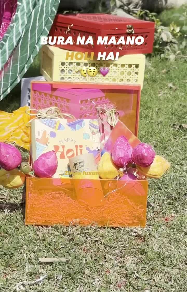 My Holi hampers are designed to be as fun and vibrant as the festival itself. I create aesthetic and unique baskets filled with organic gulal, sweets, and skincare essentials for that perfect post-Holi glow. They are perfect for gifting to loved ones or as favours for your Holi party.