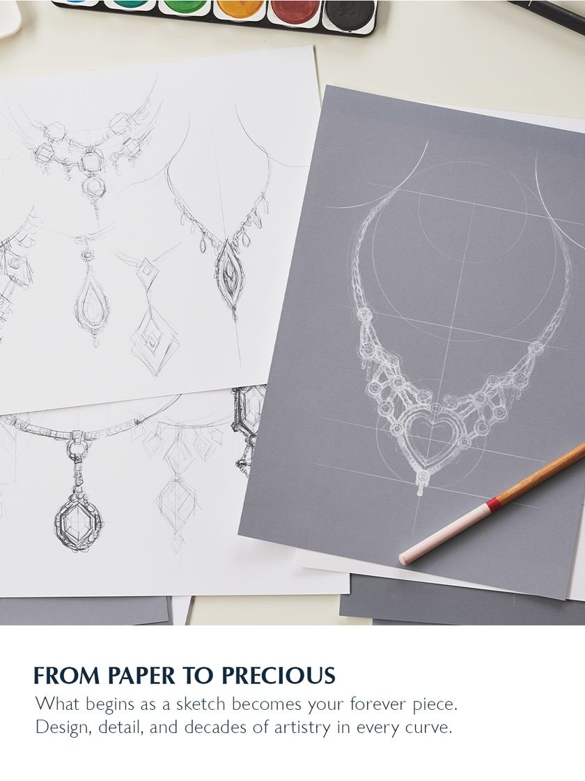 Every piece begins as a conversation and a sketch before it is brought to life by the hands of my master artisans. This is a glimpse into the meticulous process of transforming your vision from paper to precious, ensuring every detail is crafted with purpose and passion.